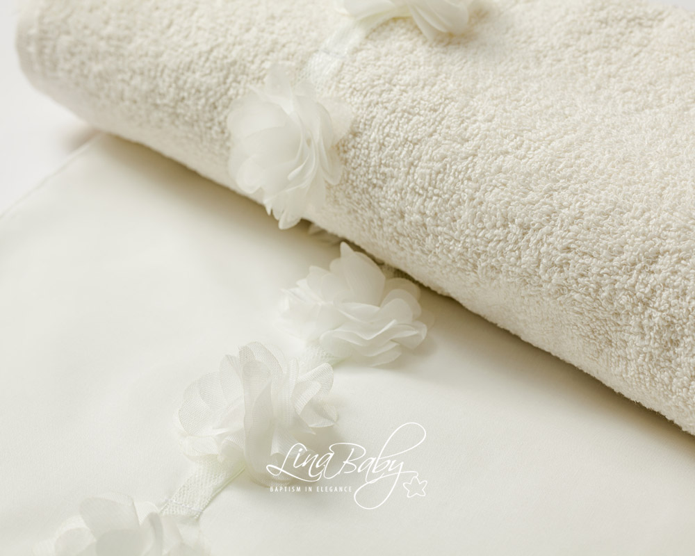 Βαμβακερό σετ λαδόπανων σε φίνα ivory απόχρωση, διακοσμημένο με απαλή σατέν κορδέλα και μια κομψή σειρά από απλικέ διακοσμητικά λουλούδια που χαρίζουν ανάλαφρη, ρομαντική αίσθηση.