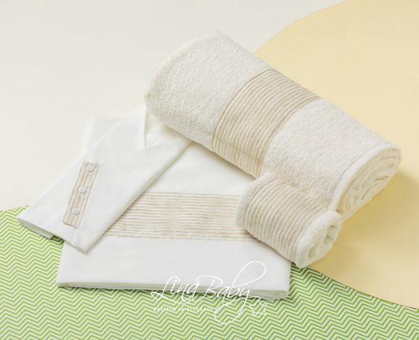 Εξαιρετικό βαμβακερό σετ λαδόπανων σε λευκό και εκρού, με φαρδιά φάσα από φίνα ριγέ οργαντίνα στους ίδιους απαλούς τόνους της βάσης.