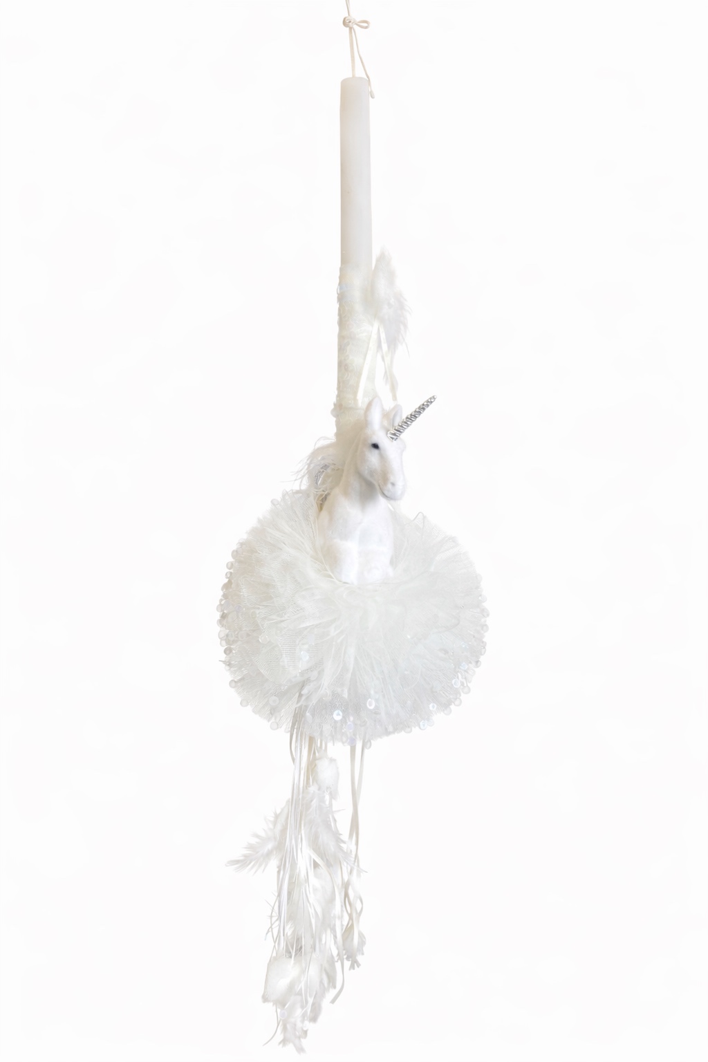 Λαμπάδα λευκού χρώματος με φουντάκι στο ιδιο χρώμα και διακοσμητική μπαλαρίνα.
