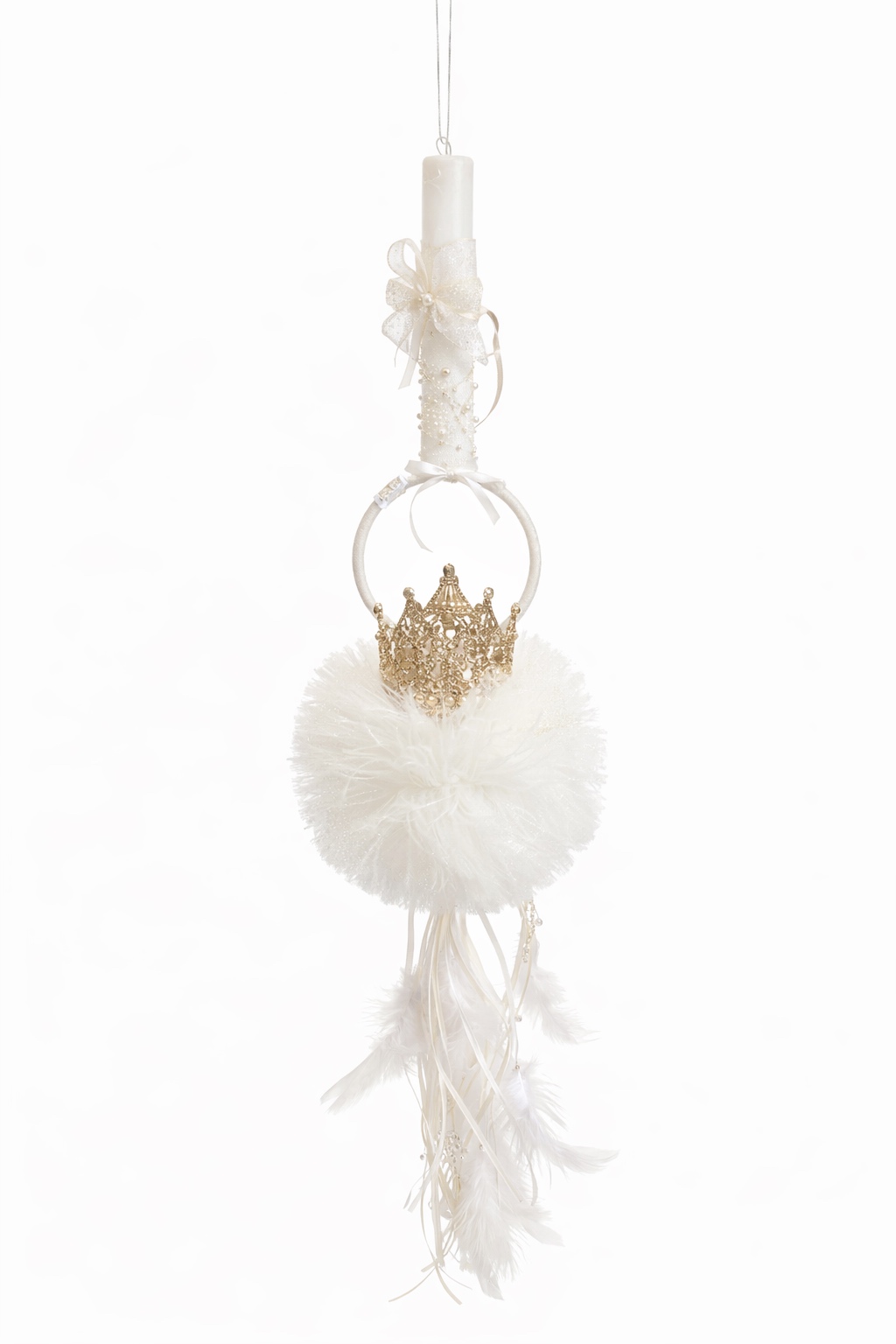 Λαμπάδα λευκού χρώματος με φουντάκι και στεφάνι στο ίδιο χρώμα και διακοσμητική κορώνα.
