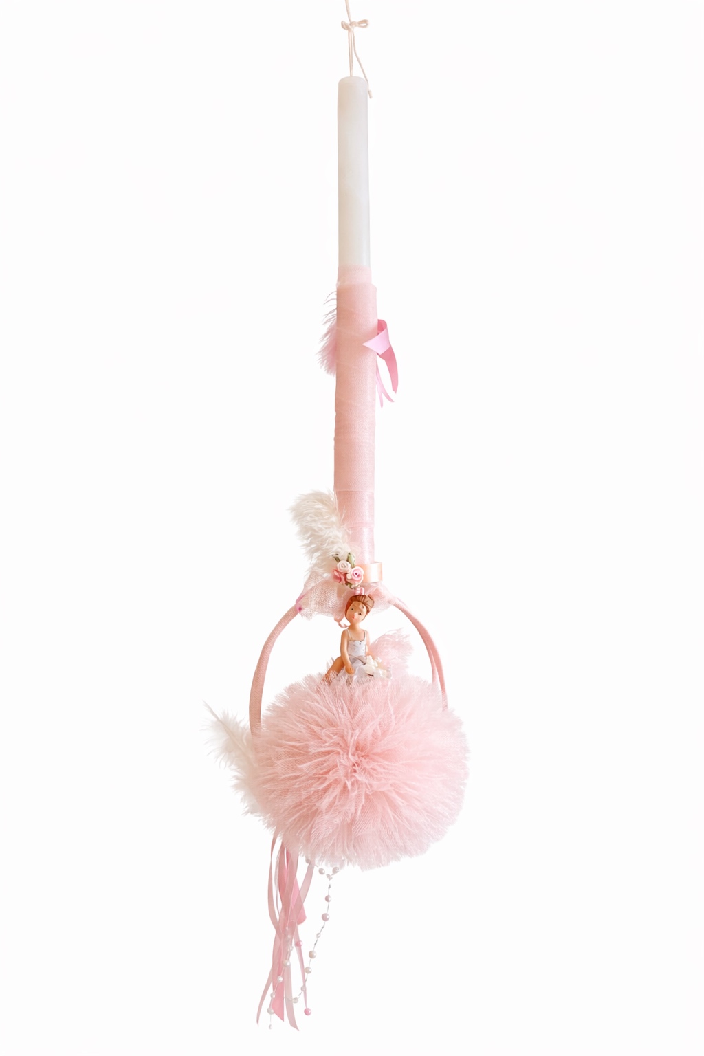 Λαμπάδα light pink χρώματος με φουντάκι και στεφάνι στο ίδιο χρώμα και διακοσμητική μπαλαρίνα.