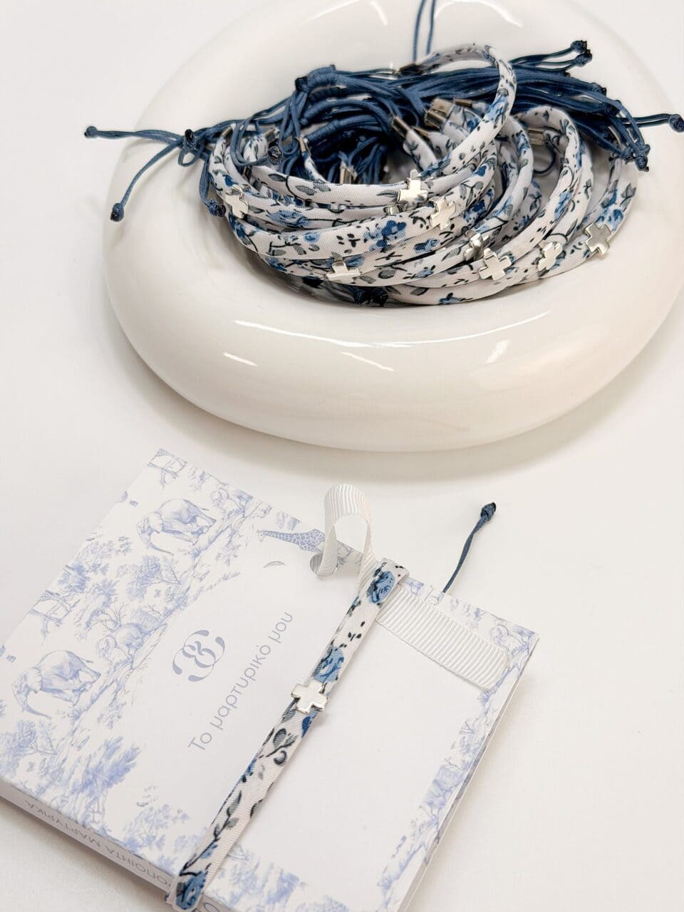 Μαρτυρικό βραχιόλι με φλοράλ ύφασμα,μπλε δέσιμο και σταυρό σε ασημί απόχρωση.