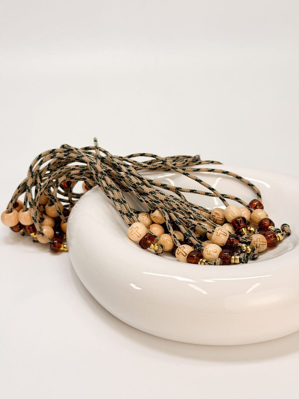 Μαρτυρικό κομπολόι με κορδόνι σε 3 αποχρώσεις,ξύλινο σταυρό και χάντρα και καφέ χάντρες.
