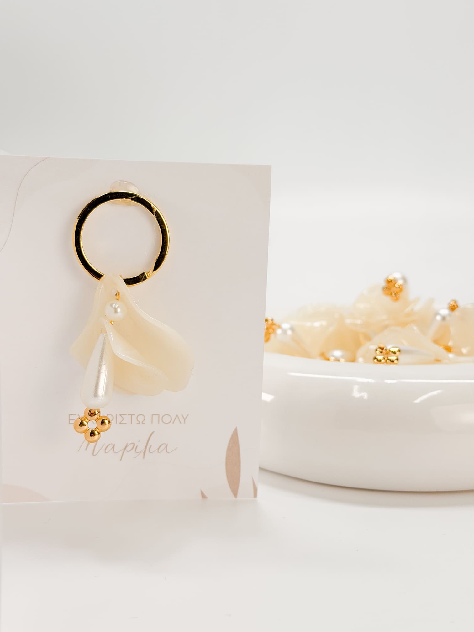 Μαρτυρικό μπρελόκ με ακρυλικά πέταλα λουλουδιού σε εκρού απόχρωση και επιχρυσωμένο σταυρό.