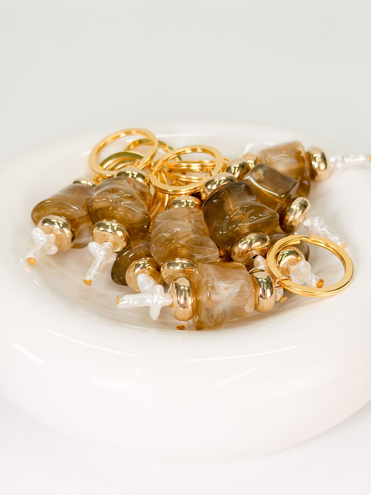 Μαρτυρικό μπρελόκ με ακρυλική μεγάλη καφέ χάντρα,μεγαλη χρυσή ροδέλα και περλέ σταυρό.