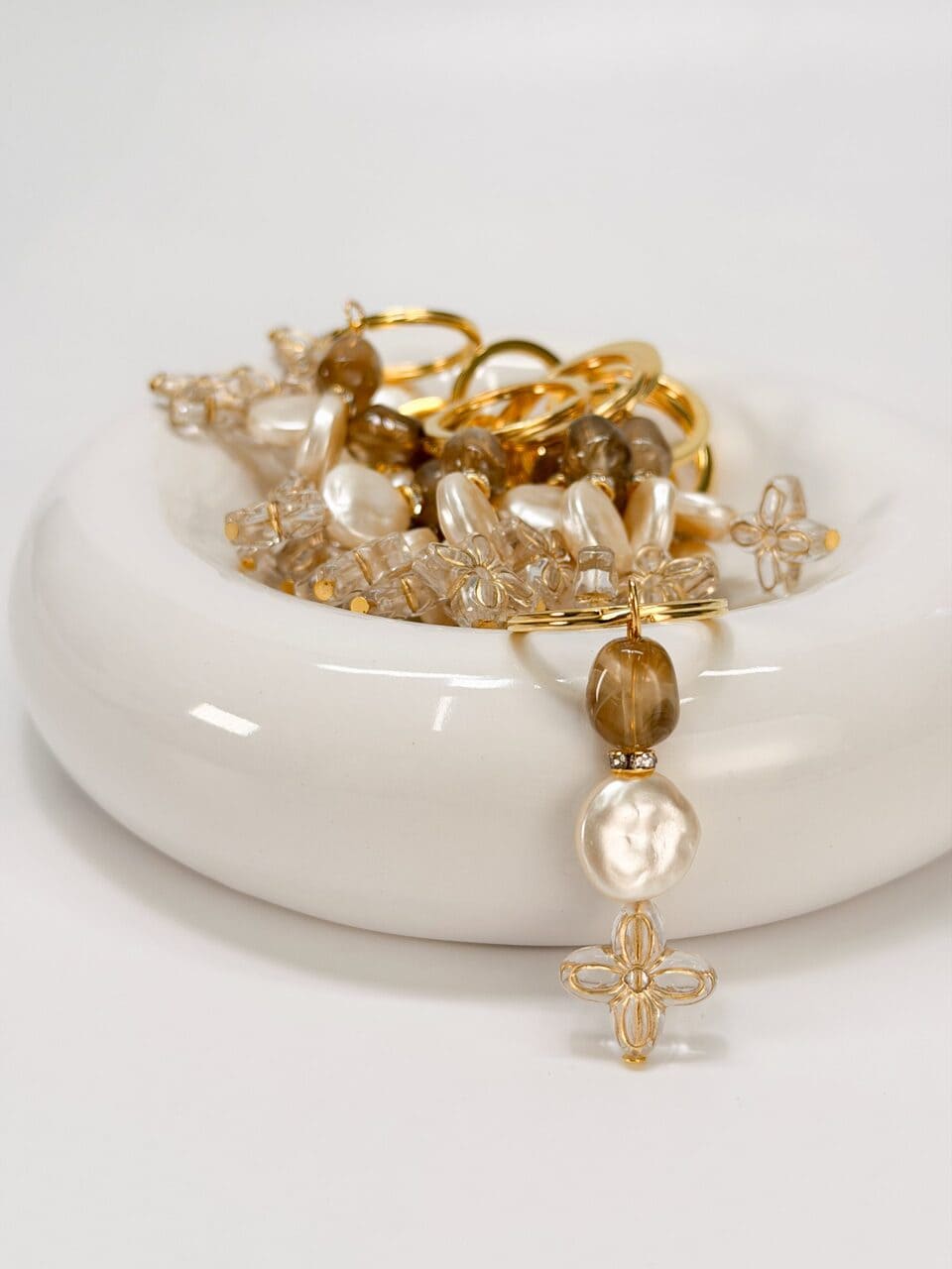 Μαρτυρικό μπρελόκ με καφέ ακρυλική χάντρα, ροδέλα με στρας, πλακε στρογγυλή πέρλα και ακρυλικό σταυρο σε σχήμα λουλουδιού.
