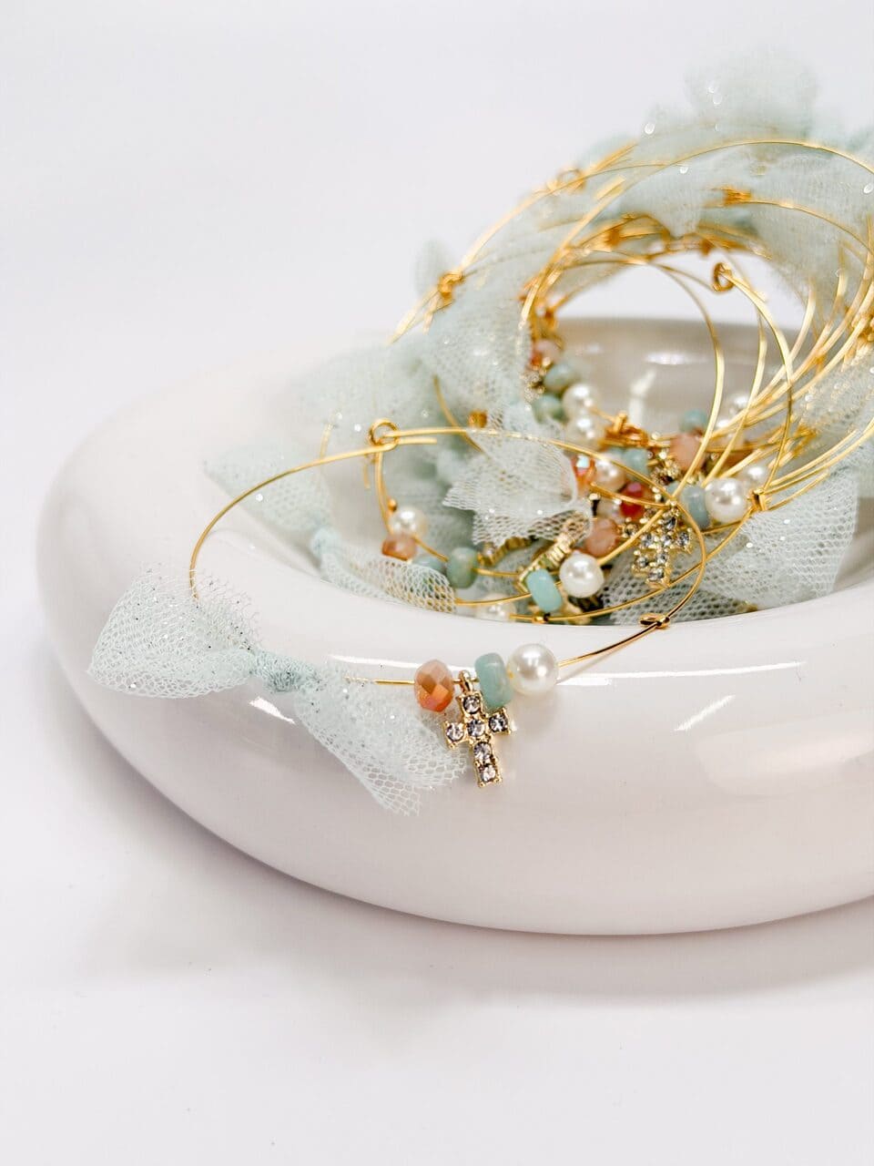 Μαρτυρικό βραχιόλι με memory wire,πέρλα,ακρυλικές δίχρωμες χάντρες,φιογκάκι απο βεραμαν τούλι με ασημι γκλιττερ και επιχρυσωμένο σταυρό με στρας.