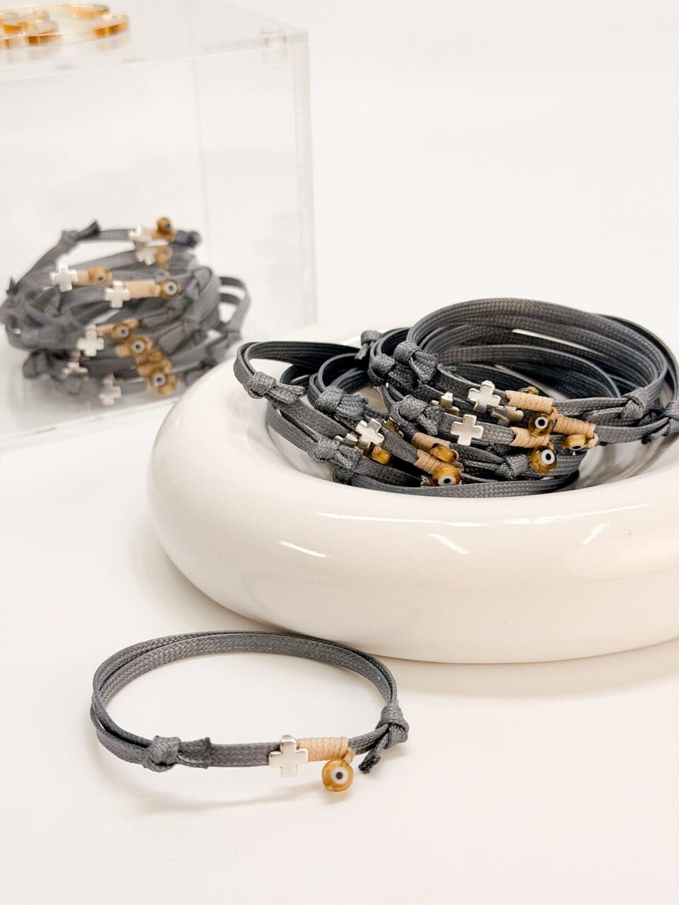 Μαρτυρικό βραχιόλι με γκρι πλακέ κορδόνι δέρμα φιδιού,σταυρό σε ασημί απόχρωση,δέσιμο και ματάκι.
