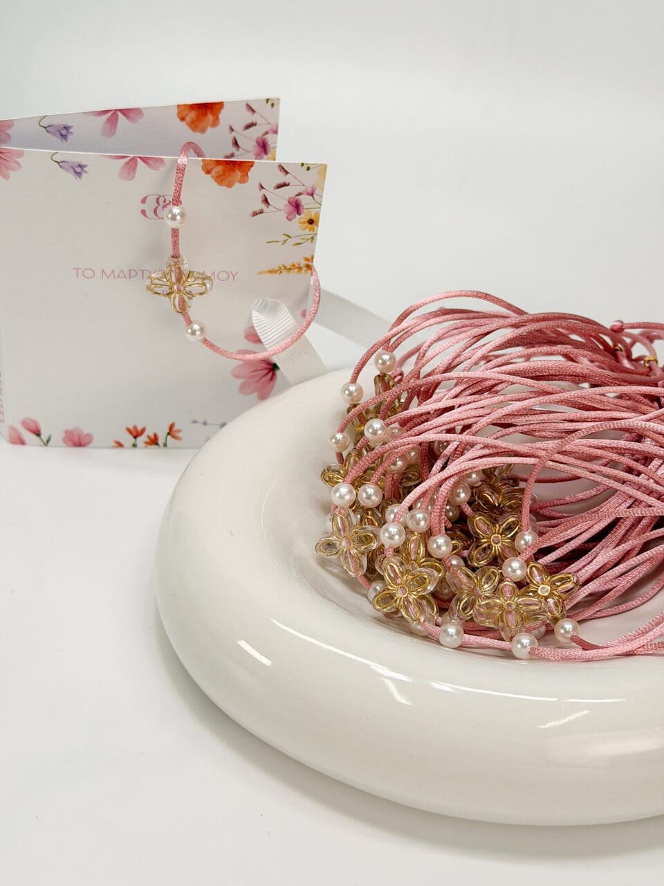 Μαρτυρικό βραχιόλι με σάπιο μήλο κορδόνι,πέρλες και ακρυλικό σταυρό σε σχήμα λουλουδιού.
