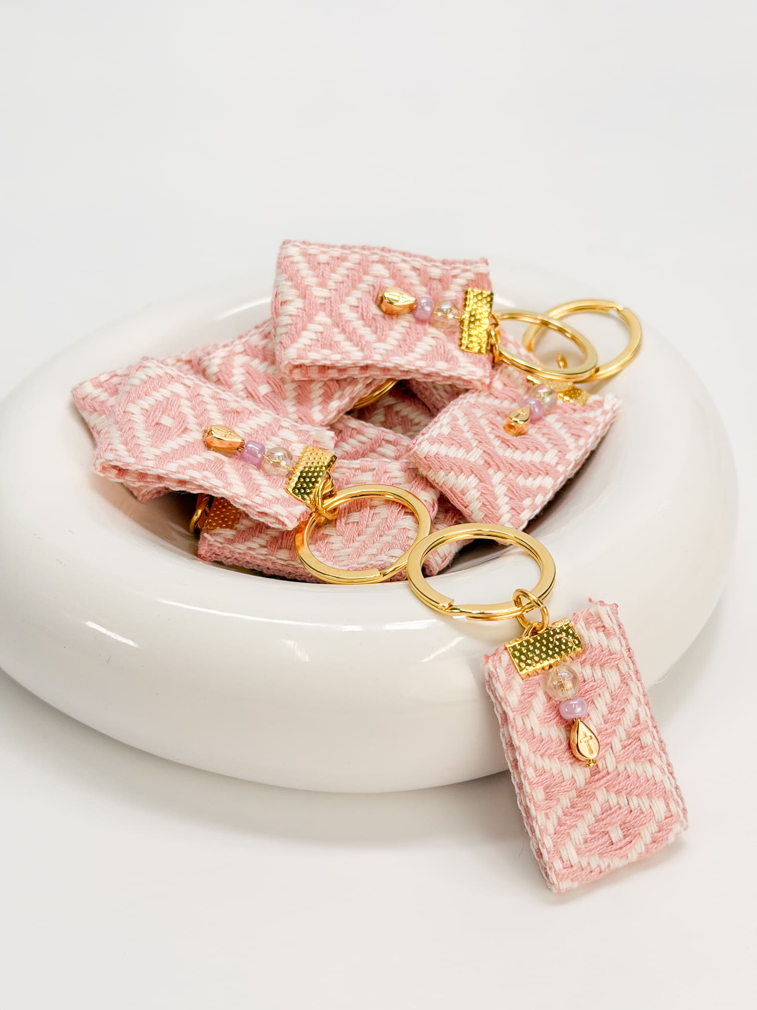 Μαρτυρικό μπρελόκ με δίχρωμη ροζ άσπρη τρέσα,επιχρυσωμένο σταυρό και χάντρες.