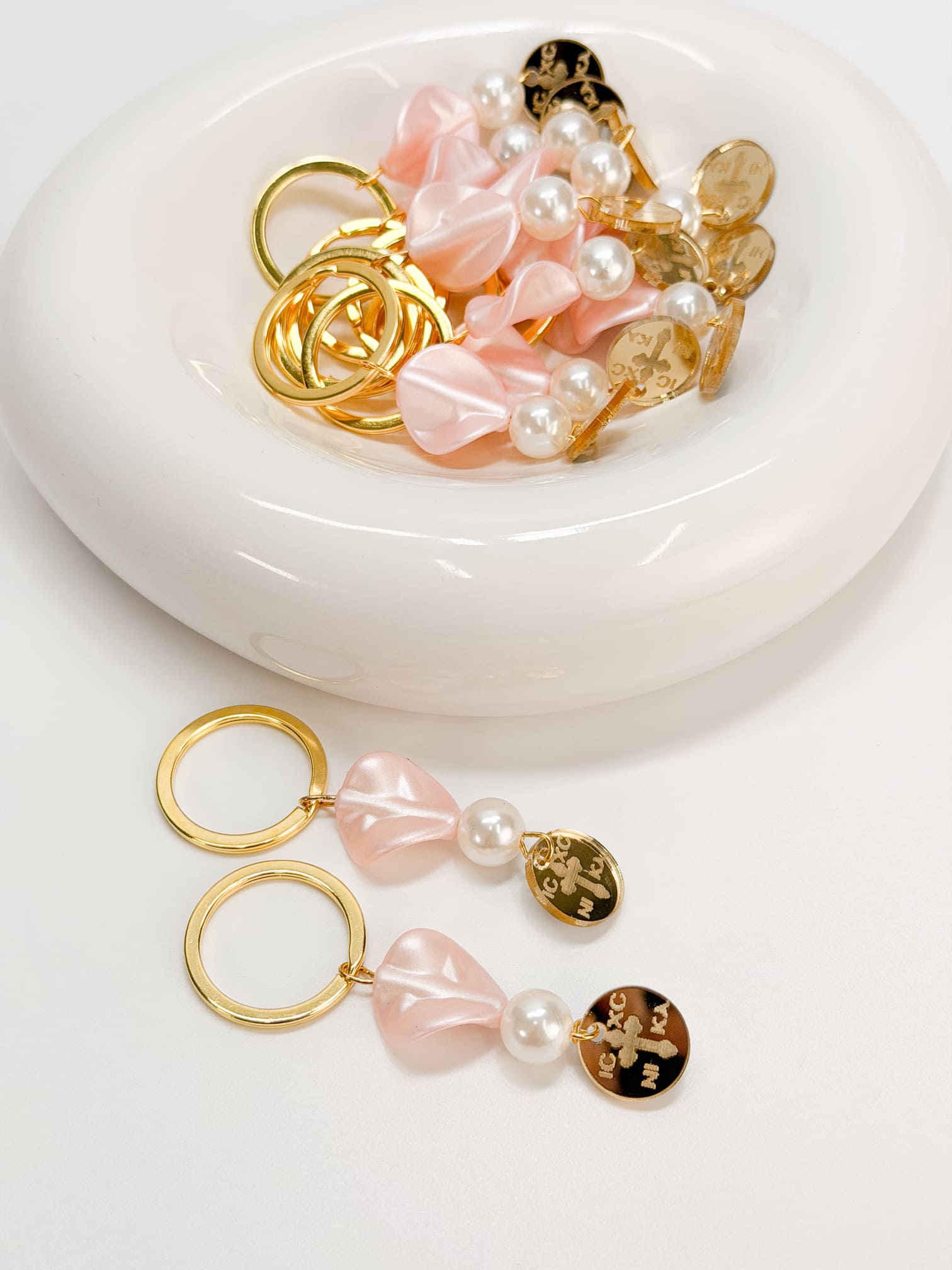 Μαρτυρικό μπρελοκ με πέρλα,πέταλο λουλουδιού και χρυσό plexiglass κωνσταντινάτο σταυρό.