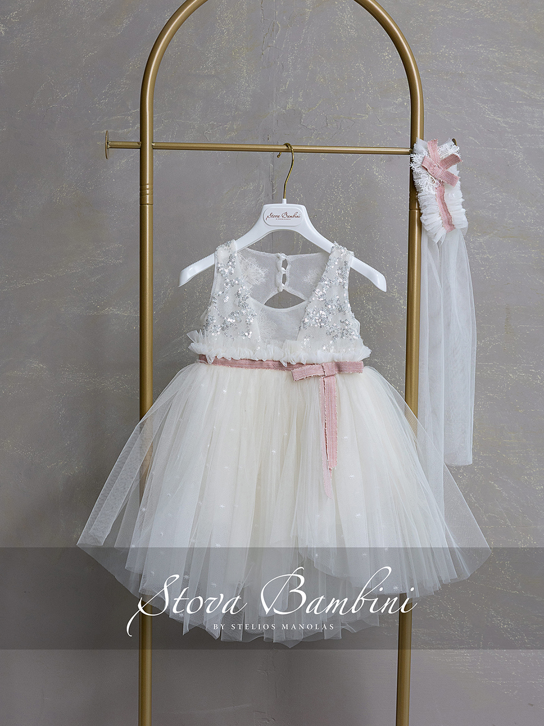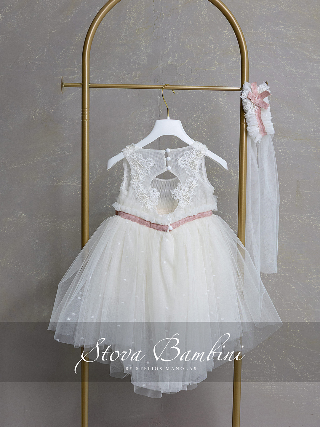 Ρομαντικό φόρεμα σε απαλή ivory απόχρωση, σχεδιασμένο για ξεχωριστές στιγμές. Το μπούστο από φίνα διαφάνεια αγκαλιάζεται από λαμπερές παγιέτες Ιταλίας που χαρίζουν διακριτική λάμψη, ενώ η ανάλαφρη φούστα από κεντημένο φίνο τούλι Γαλλίας δημιουργεί μια αέρινη κίνηση. Ιδιαίτερη έμφαση δίνεται στην πλάτη, όπου το μοναδικό cut-out σχέδιο με κουμπάκια και εκλεπτυσμένες δαντελένιες λεπτομέρειες αποπνέει ρομαντισμό και φινέτσα. Η dusty-pink ζώνη Γαλλίας με φιόγκο τονίζει απαλά τη μέση, προσθέτοντας μία κομψή χρωματική αντίθεση που ολοκληρώνει αρμονικά το σύνολο. Όλα τα φορέματα διαθέτουν εσωτερική επένδυση 100% Cotton για απόλυτη άνεση. Διαθέσιμα μεγέθη: 6–36 μηνών και κατά παραγγελία μεγαλύτερα μεγέθη. Όλη η συλλογή σχεδιάζεται και κατασκευάζεται στην Ελλάδα.