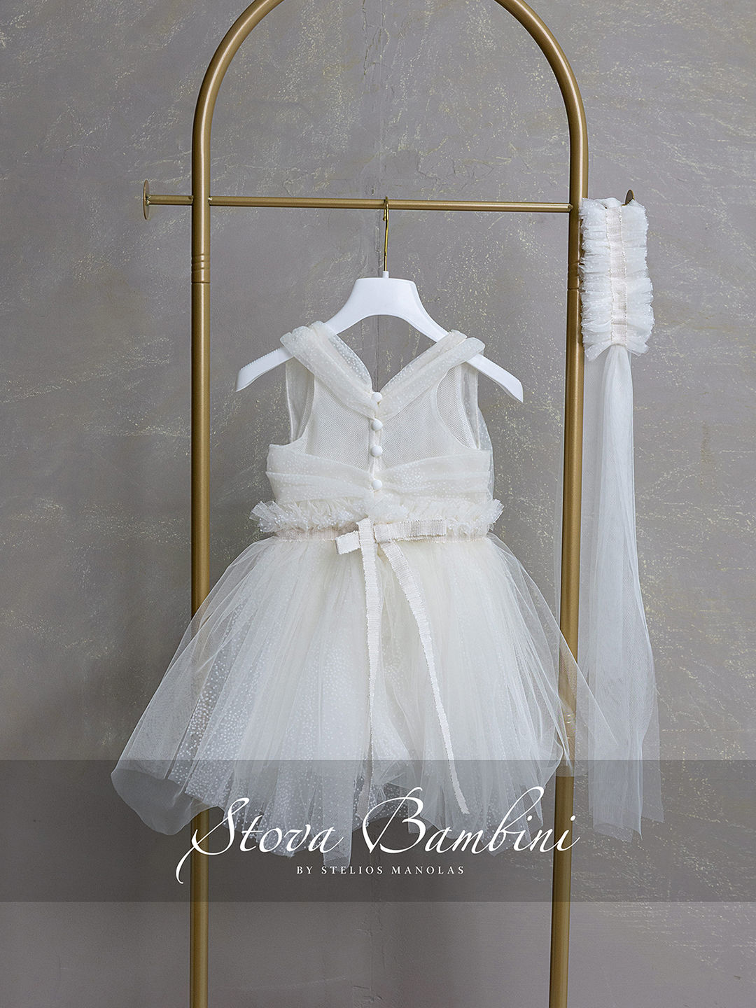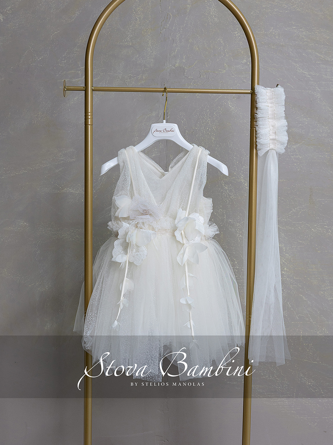 Αέρινο και λαμπερό βαπτιστικό φόρεμα σε εκλεπτυσμένη ivory απόχρωση, σχεδιασμένο για ξεχωριστές στιγμές. Το μπούστο αγκαλιάζει απαλά το σώμα με διακριτική διαφάνεια και φίνα υφή, ενώ η ιδιαίτερη ζώνη με κεντημένες λεπτομέρειες χαρίζει μία αίσθηση διακριτικής πολυτέλειας. Η φούστα εντυπωσιάζει με το πολυεπίπεδο τούλι Ιταλίας που δημιουργεί κίνηση και ανάλαφρη αίσθηση, ενώ η μεγάλη, χειροποίητη floral σύνθεση στο πλάι προσθέτει ρομαντισμό και μοναδικό χαρακτήρα στο σύνολο. Η πλάτη ολοκληρώνεται με φίνα δεσίματα στους ώμους και εντυπωσιακό φιόγκο, αναδεικνύοντας την κομψότητα του σχεδίου από κάθε πλευρά.Όλα τα φορέματα διαθέτουν εσωτερική επένδυση 100% Cotton για απόλυτη άνεση. Διαθέσιμα μεγέθη: 6–36 μηνών και κατά παραγγελία μεγαλύτερα μεγέθη. Όλη η συλλογή σχεδιάζεται και κατασκευάζεται στην Ελλάδα.Βαπτιστικό Σετ Stova Bambini SS26 G20